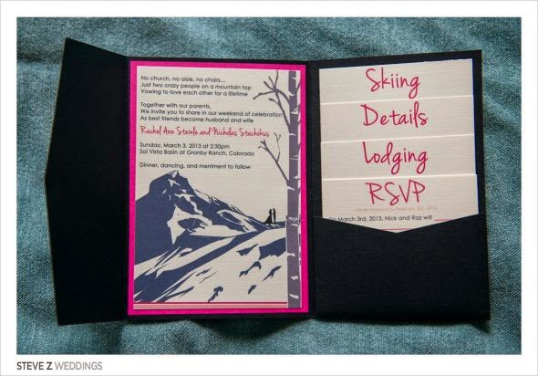Przenieśmy się na chwilę do Stanów. Na kilka miesięcy przed ślubem, para postanowiła zrobić save the date dla gości, które to już mówiło o motywie przewodnim ślubu jak i miejscu uroczystości. Później przyszedł czas na ręcznie malowane zaproszenia. Gdy nastał ten dzień, goście otrzymali plan dnia, dziewczynki sypiące kwiatki, sypały... śnieg z konfetti. Drogę na uroczystość ślubną znaczyły kijki od nart, przewiązane organzą. Na czubku tortu, stały... słodkie...szyszki, damska szyszka miała welon :)