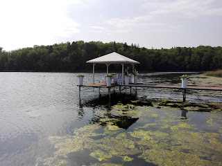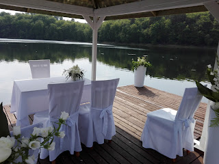 Pierwsze co się widzi, wjeżdżając na parking, to restauracja i recepcja. Wiedziałam, bo przeczytałam, że dzień otwarty będzie w namiocie, więc to jego musieliśmy szukać. Okazało się, że nie musimy za bardzo wytężać wzroku. Uwaga! Było oznakowanie!! Chyba po raz pierwszy spotkałam się na dniach otwartych, na targach z tabliczkami wskazującymi drogę. Brawo, brawo!! I nagle, zza budynkiem ukazał nam się widok... Przepiękny, cudowny... Nie obchodził nas już namiot. Bardziej byliśmy zainteresowani jeziorem, pomostem i przygotowanym miejscem na pomoście dla ślubu w plenerze. Cały pomost jest przygotowany i zaaranżowany na to ważne wydarzenie. Wszystko do siebie pasuje, a o detale i szczegóły zadbano.